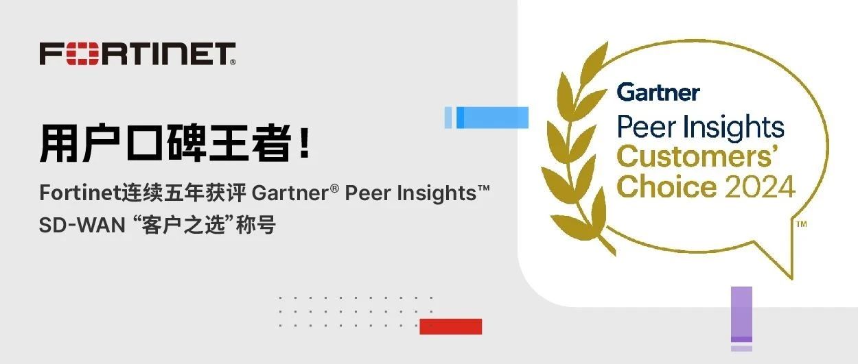 用戶口碑王者!Fortinet連續(xù)五年獲評(píng) Gartner? Peer Insights? SD-WAN “客戶之選”稱號(hào) 2024-04-07 近日,F(xiàn)ortinet安全SD-WAN解決方案憑借最多評(píng)論數(shù)和最優(yōu)評(píng)分脫穎而出,再次獲評(píng)Gartner?PeerInsights?SD-WAN“客戶之選”稱號(hào)。至此,F(xiàn)ortinet已連續(xù)5年摘得此項(xiàng)殊榮。截至2023年12月31日(即本次...
